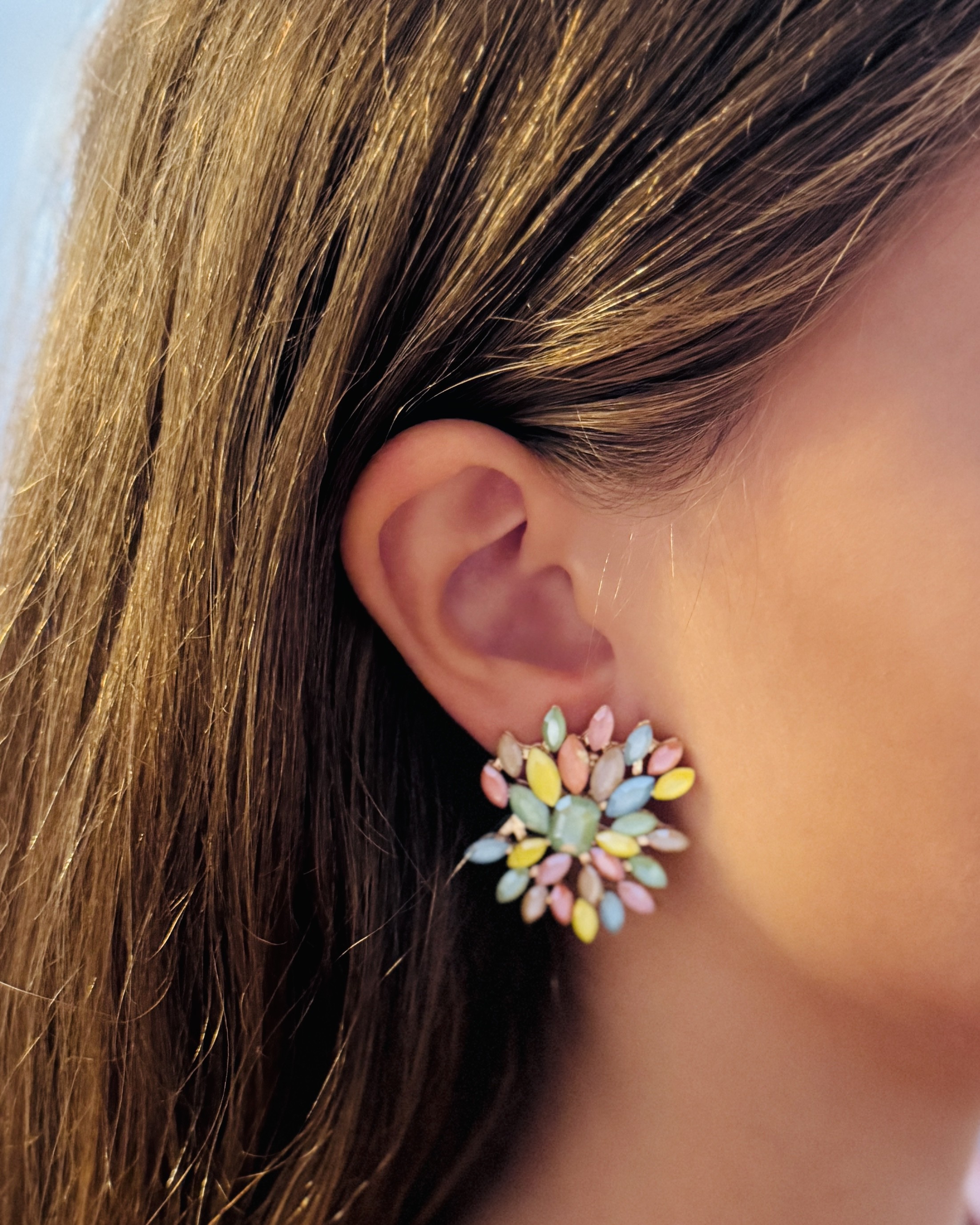 Pendientes llamativos en forma de flor grande con cristales en todos pastel ( rosa, azul, amarillo, verde y lila. )